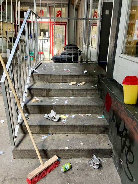 Noch ein paar Betontreppenstufen bis zur Eingangstür am Café. Doch die ist mal wieder nur in einem Slalom um Blutflecken und verwendete Spritzen herum zu erreichen. Zeugnisse der vergangenen Nacht. Gott sei Dank ist der Leuchtbandschriftzug GOTT HÖRT DEIN GEBET 24/7 im Schaufenster des Cafés zu sehen. Egal wie groß die Not auch ist, Gott ist immer da.